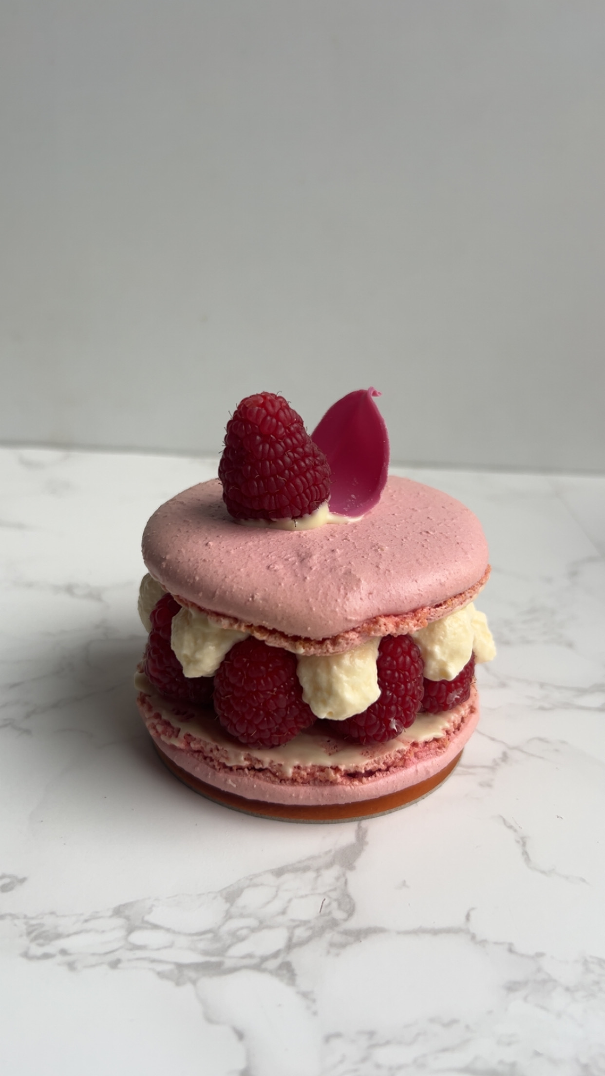 Frambozen macaron gebakje Vulling keuze uit witte chocolade mousse of champagne mousse